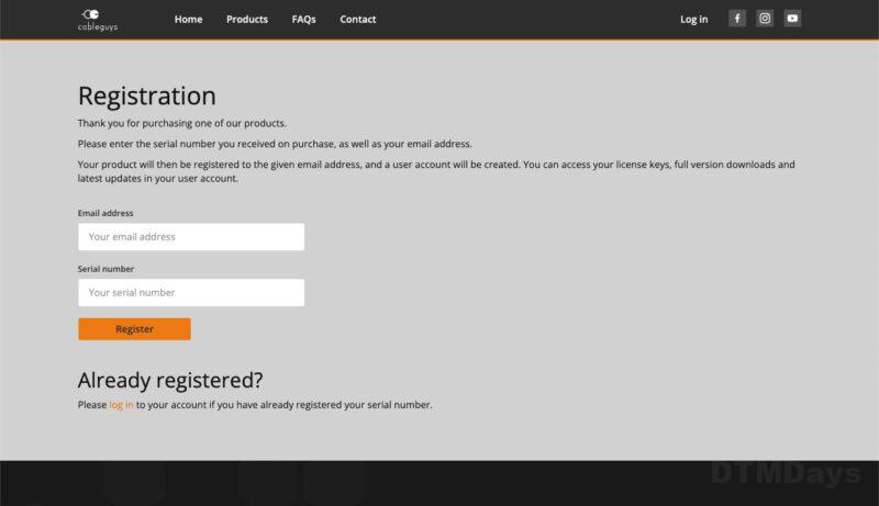 Cableguys製品のシリアルを入手しているユーザは、Registrationページから製品登録します。既にアカウントを持っているユーザーも同じメールアドレスを使って登録します。