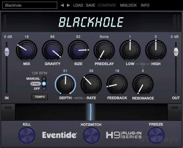 Blackhole は、その名の通り宇宙のように大きい現実離れしたリバーブプラグインです。銀河系サウンドのスペースワーピングやドローンを作成できますが、重要な楽器を強調したり、音楽的なかすかな効果をミックスに与えることも可能です。ギターを弾く方はエフェクトペダルとして見たことがあるかもしれません。Bkackhole単体でペダルがありますし、Spaceというリバーブペダルにも搭載されています。マルチなエフェクトペダルの H9 Harmonizerにも搭載されいるリバーブです。