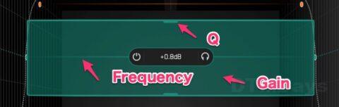 各バンドは、オン/オフ、ベル/シェルフの切り替え、ソロリッスン、M/Sモード、Q、Frequency、Gainの調整が可能です。ゲインは色の付いているエリアから調整できますが、Frequencyの選択部分が少ないです。