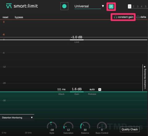 Constant Gainは非常に便利な機能で、リミッター処理されたサウンドとドライサウンドのレベルを一致させます。人間の耳は、大きな音をより良い音と感じる傾向があるため、この機能によりレベルを均一にすることで、ダイナミクス、トランジェント、サチュレーションの変化をより正確に比較することが可能です。