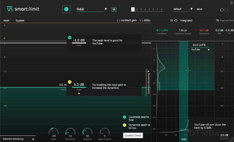 最後にQuality Checkを行うと、ラウドネスとダイナミクスが推奨エリアからはみ出しているかどうかを判断し、必要に応じて警告を表示します。このチェックにより、視覚的にも確認が可能です。さらに、ターゲットラウドネスに合わせるために必要なアウトプットゲインの調整量を自動で計算してくれるため、非常に便利です。